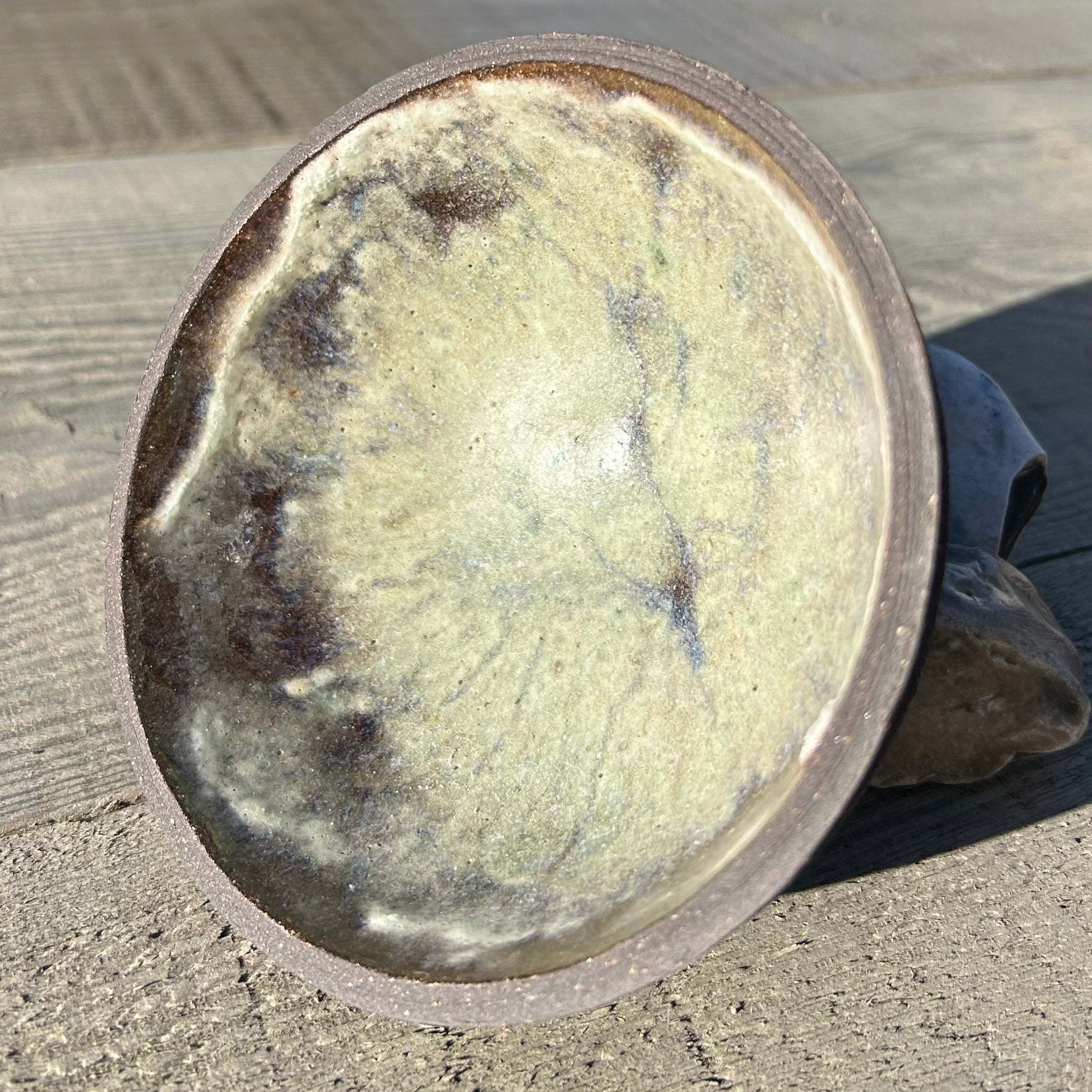 L’émail de cendres de bois, déposé en fine couche, se transforme au feu en une matière vivante : chaque cuisson révèle des nuances imprévisibles, entre crème, gris et reflets d’olive.