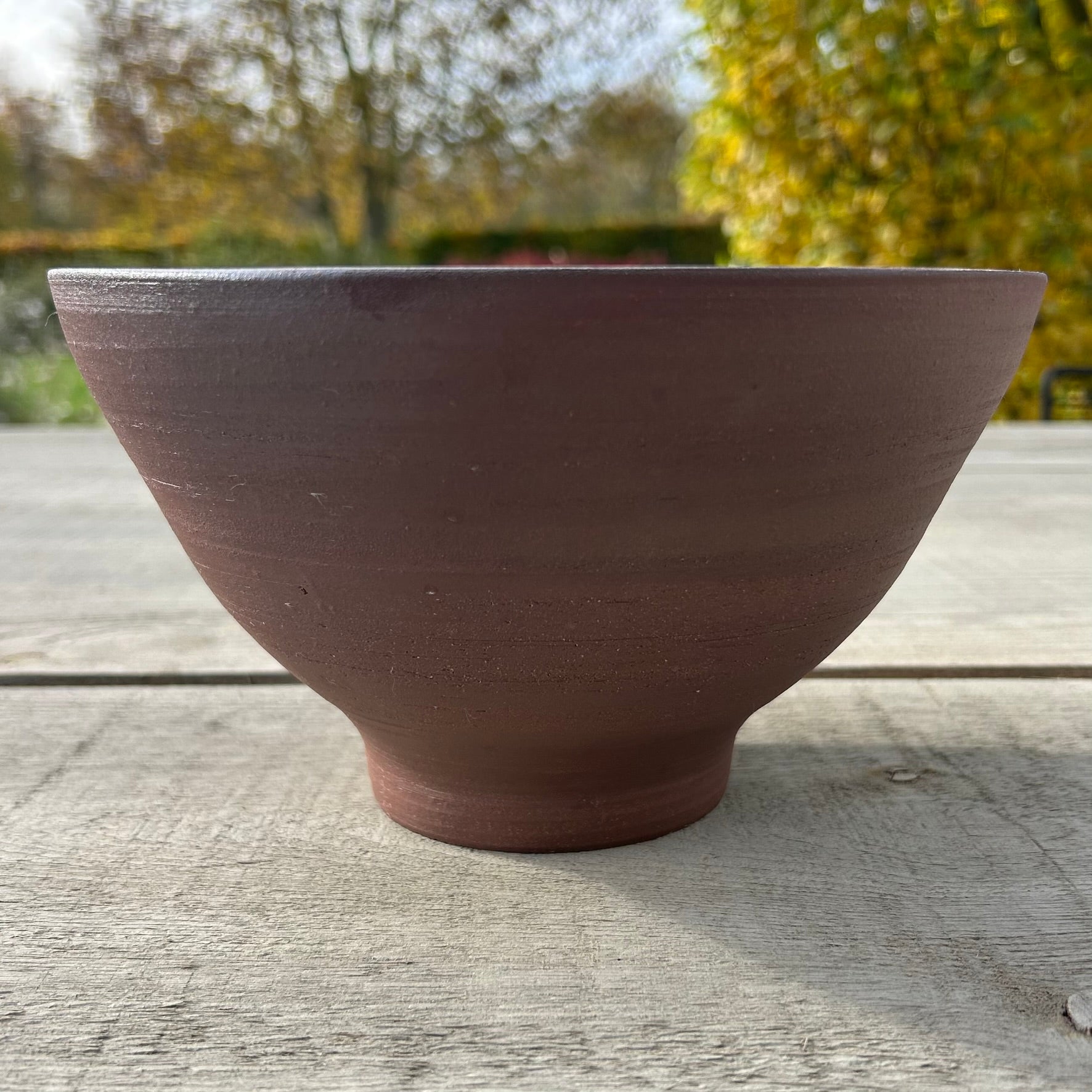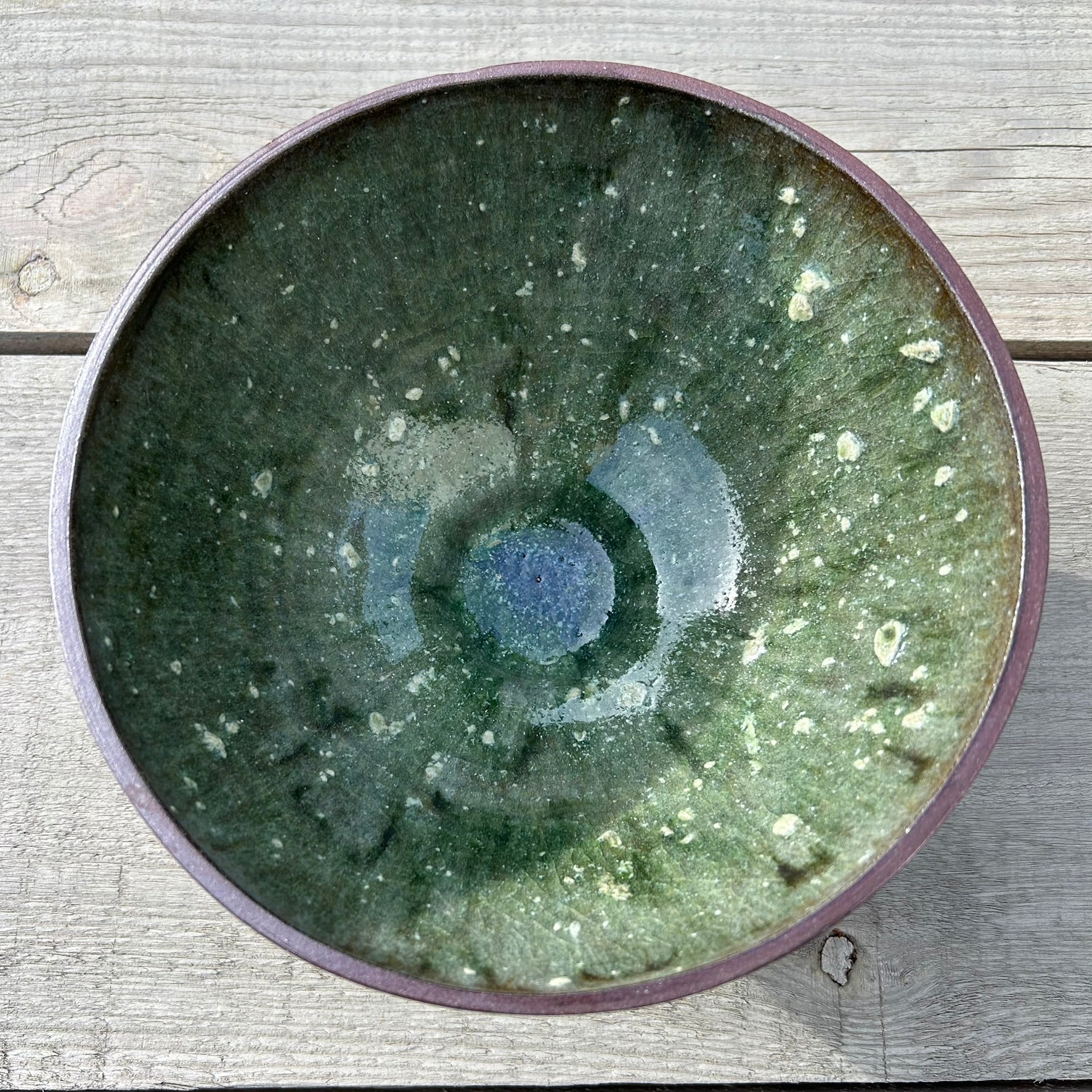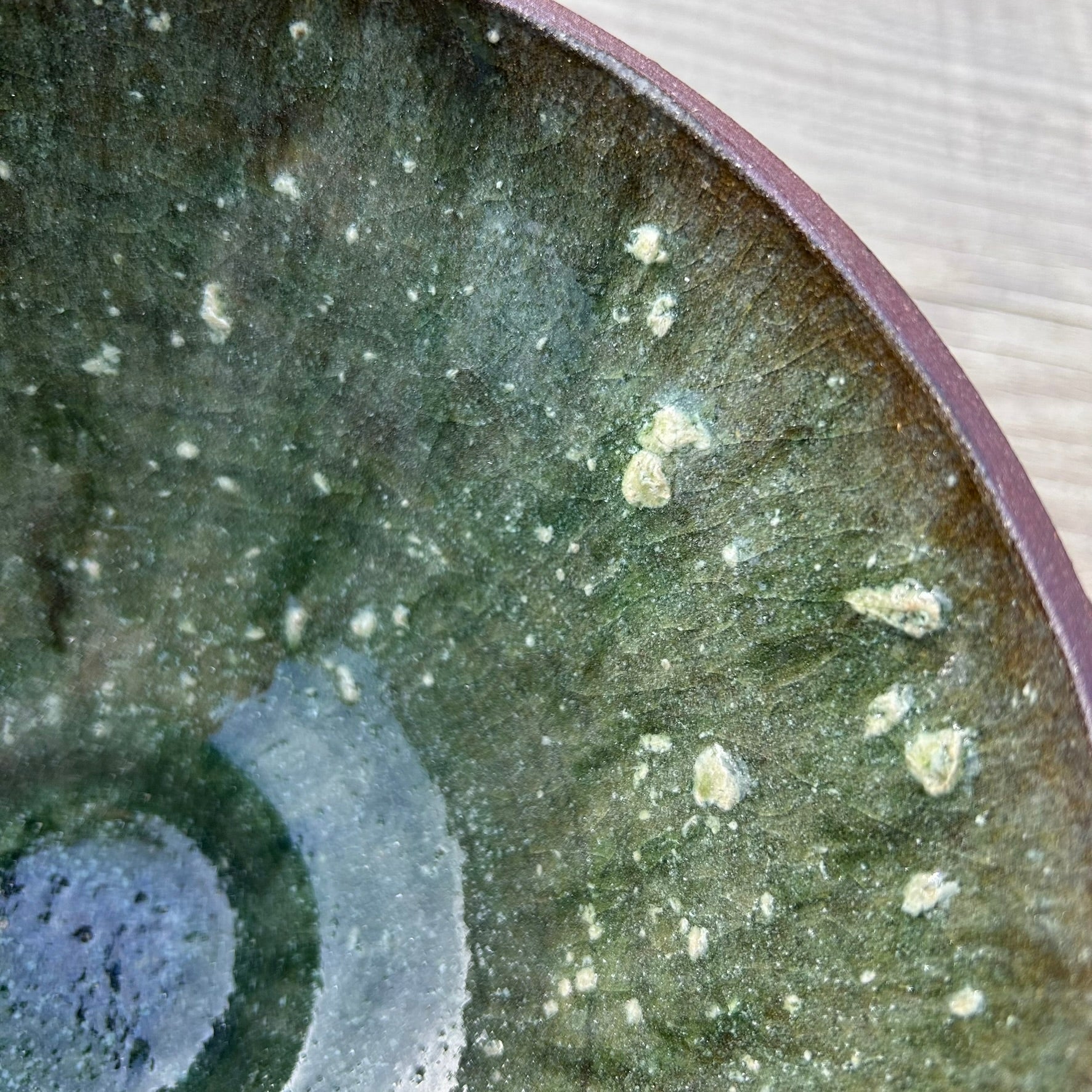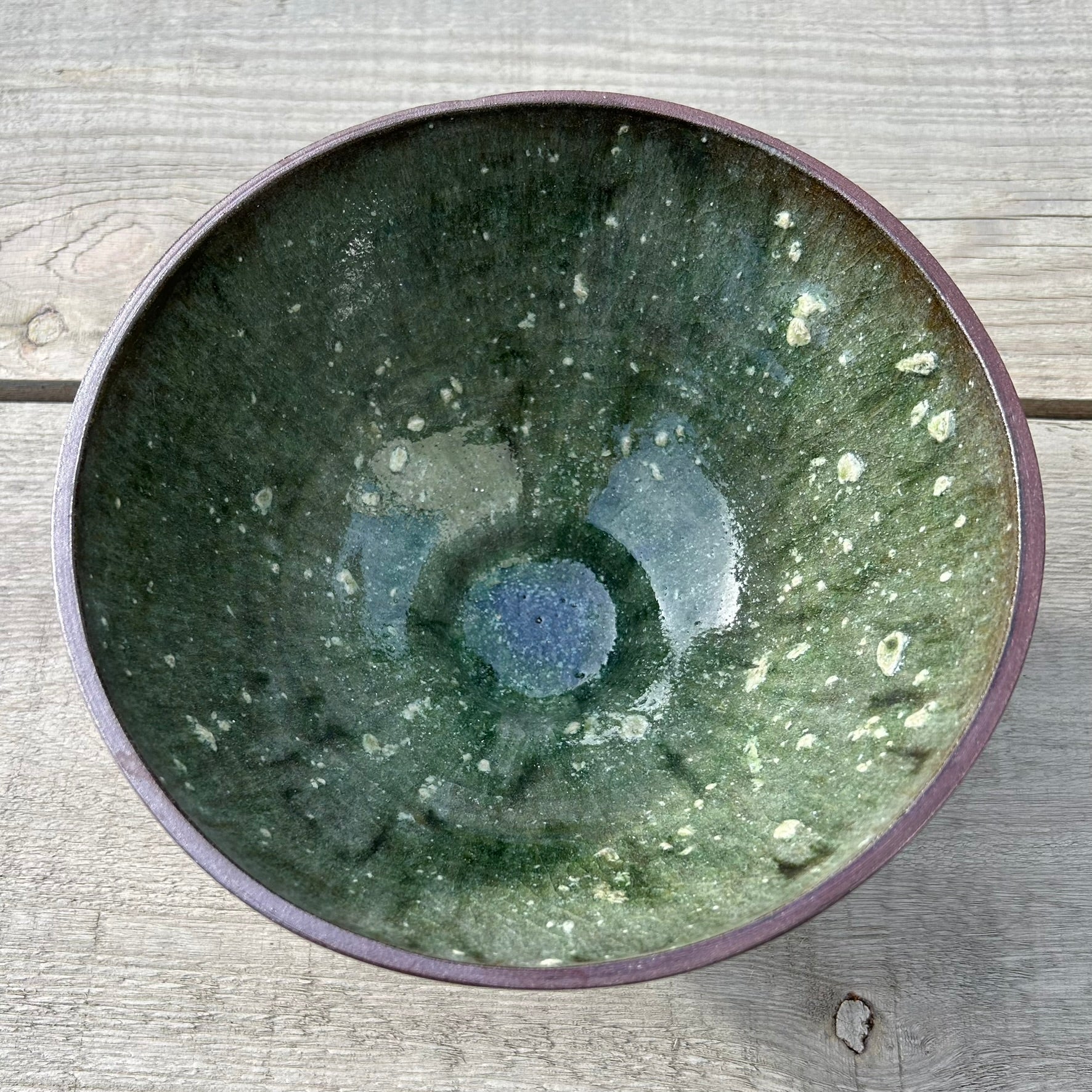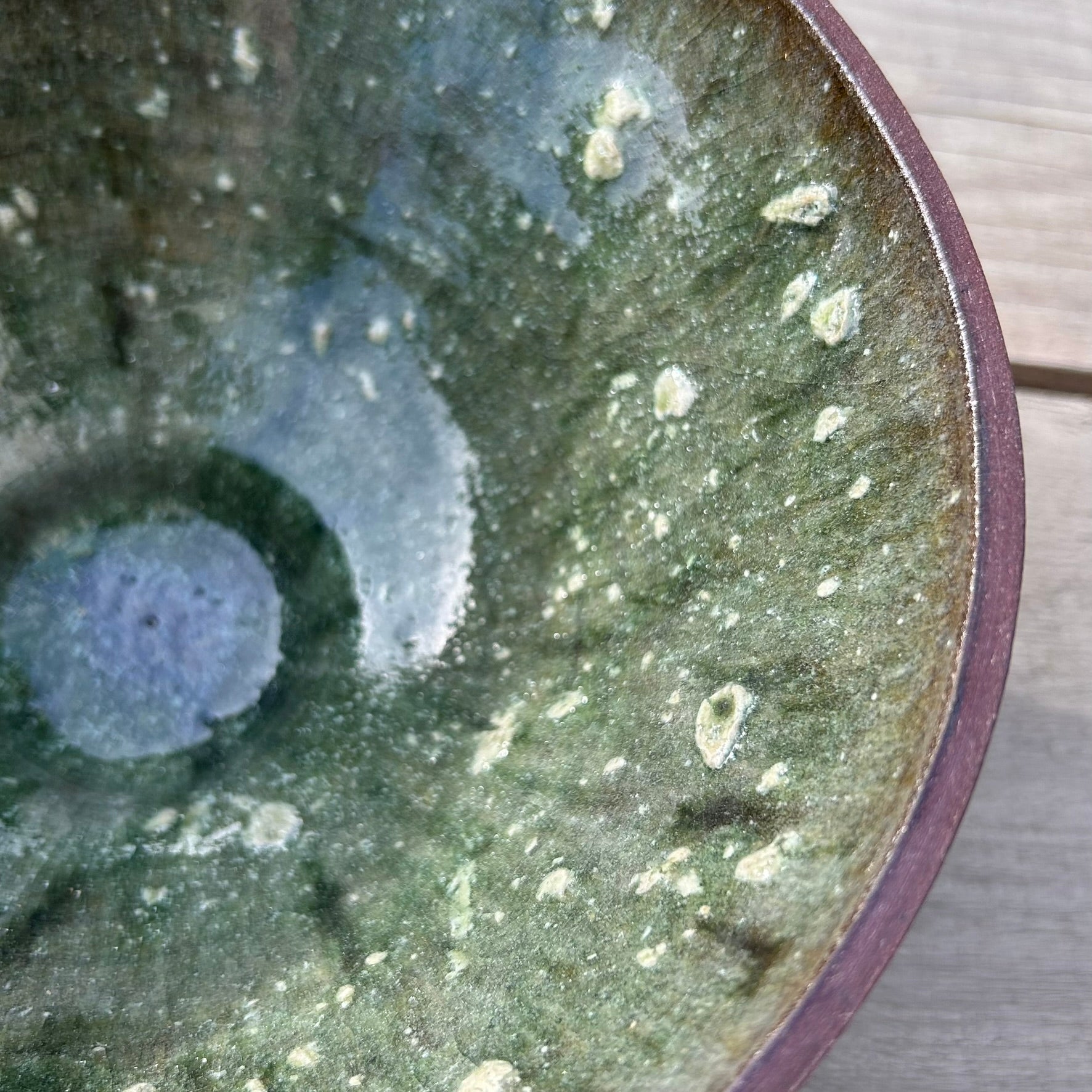 Façonné dans une terre rouge fine, ce bol se pare d’un émail vert profond ponctué de cristallisations naturelles.