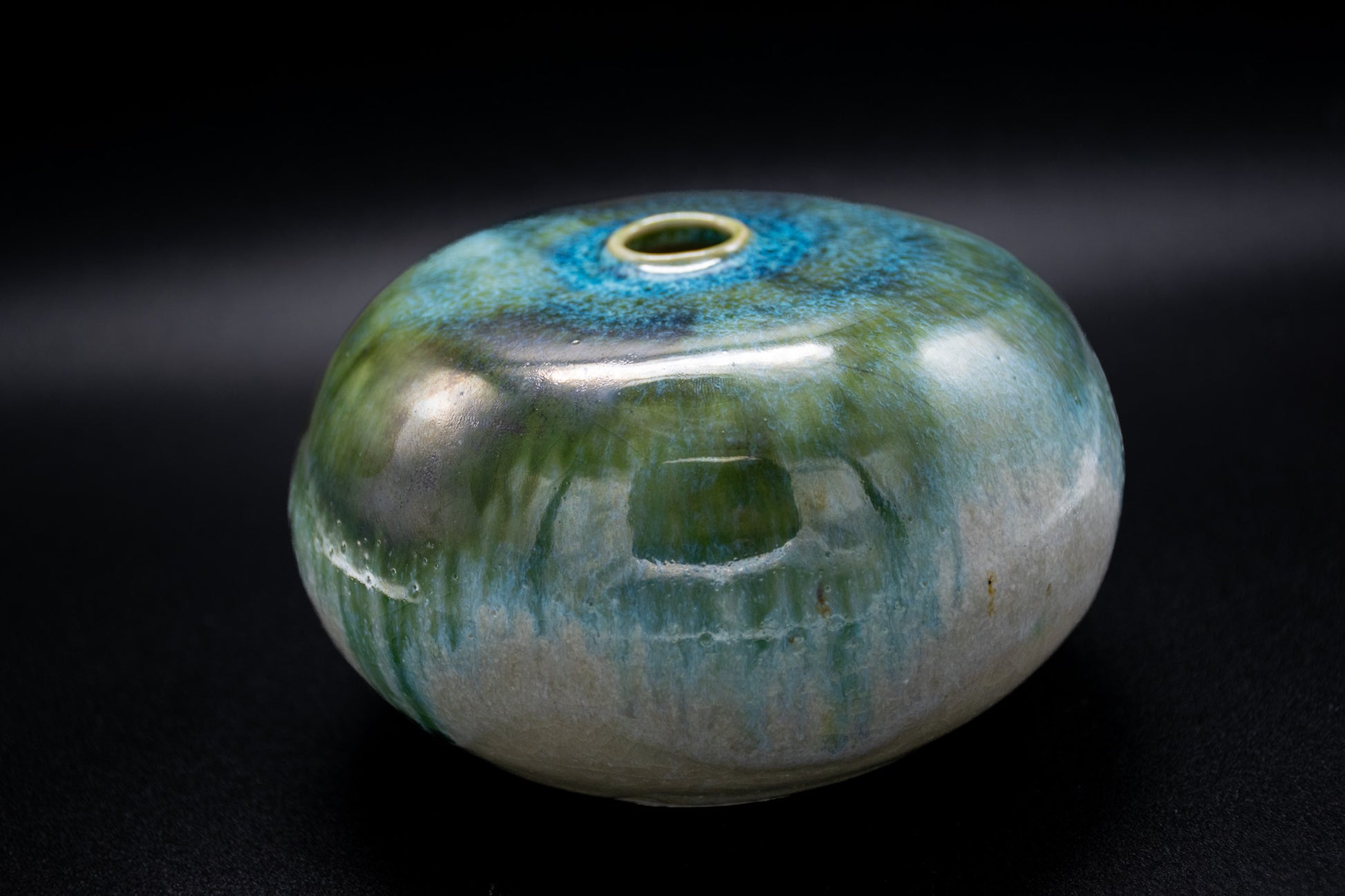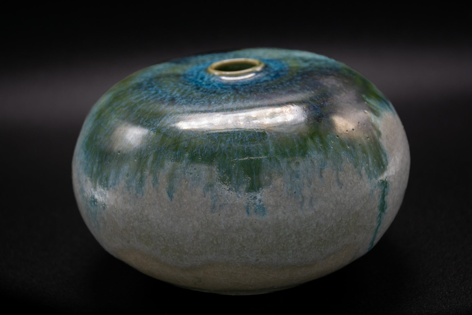 L’émail, aux nuances de bleu, vert et cendre, se déploie comme une surface d’eau changeante — chaque cuisson révèle une variation unique.
