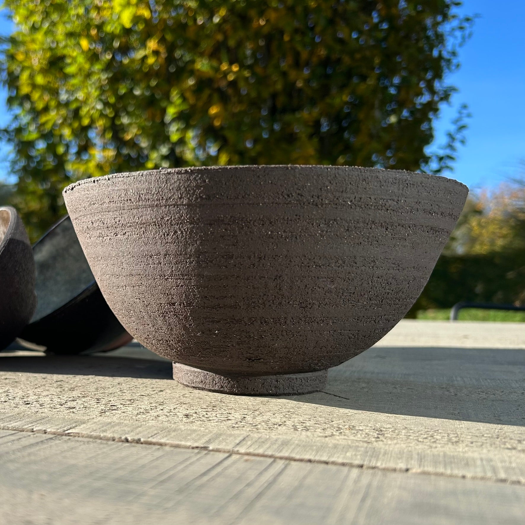 Tourné dans un grès sombre, ce bol dévoile à l’intérieur un émail clair, presque lunaire, parsemé de fines ponctuations nées du feu.