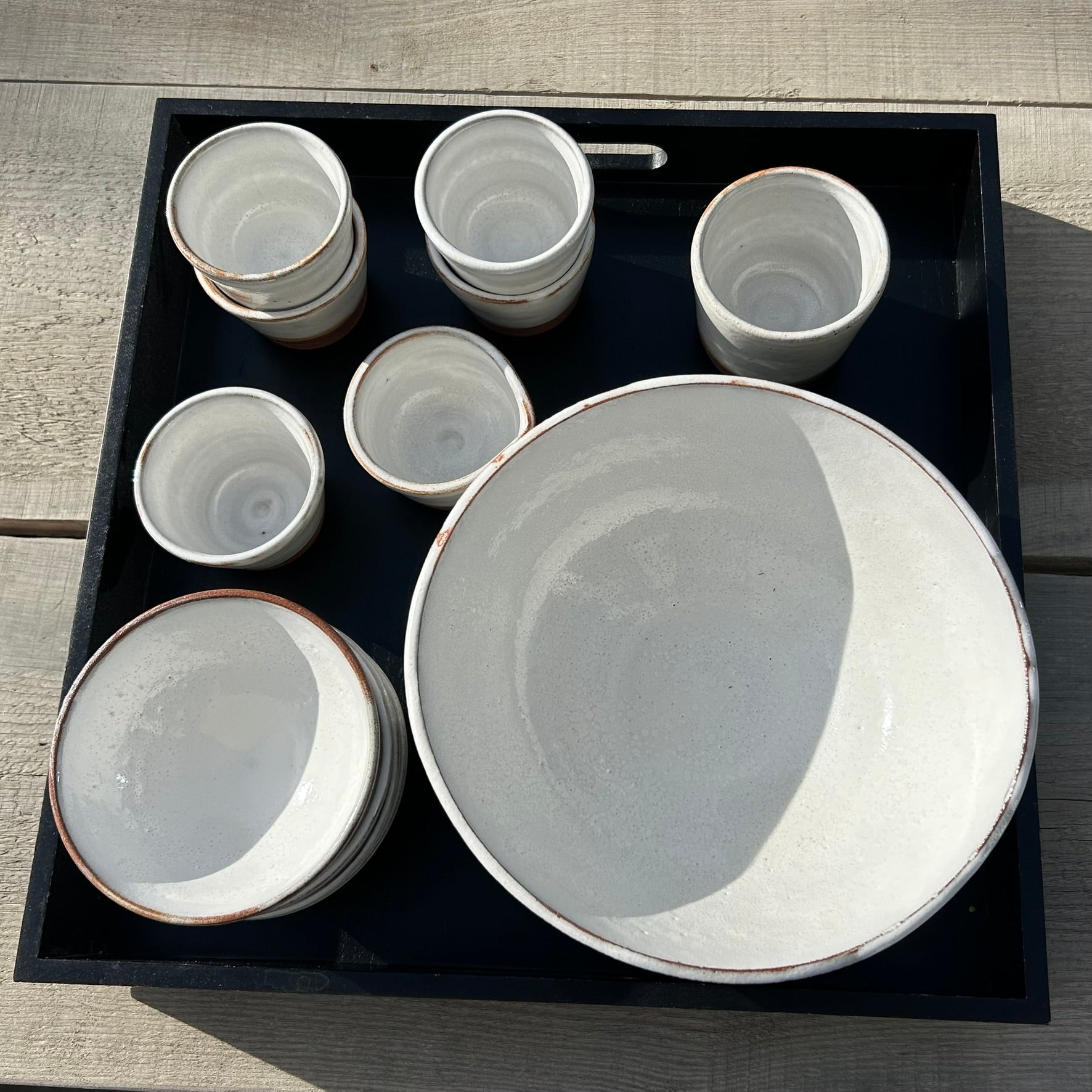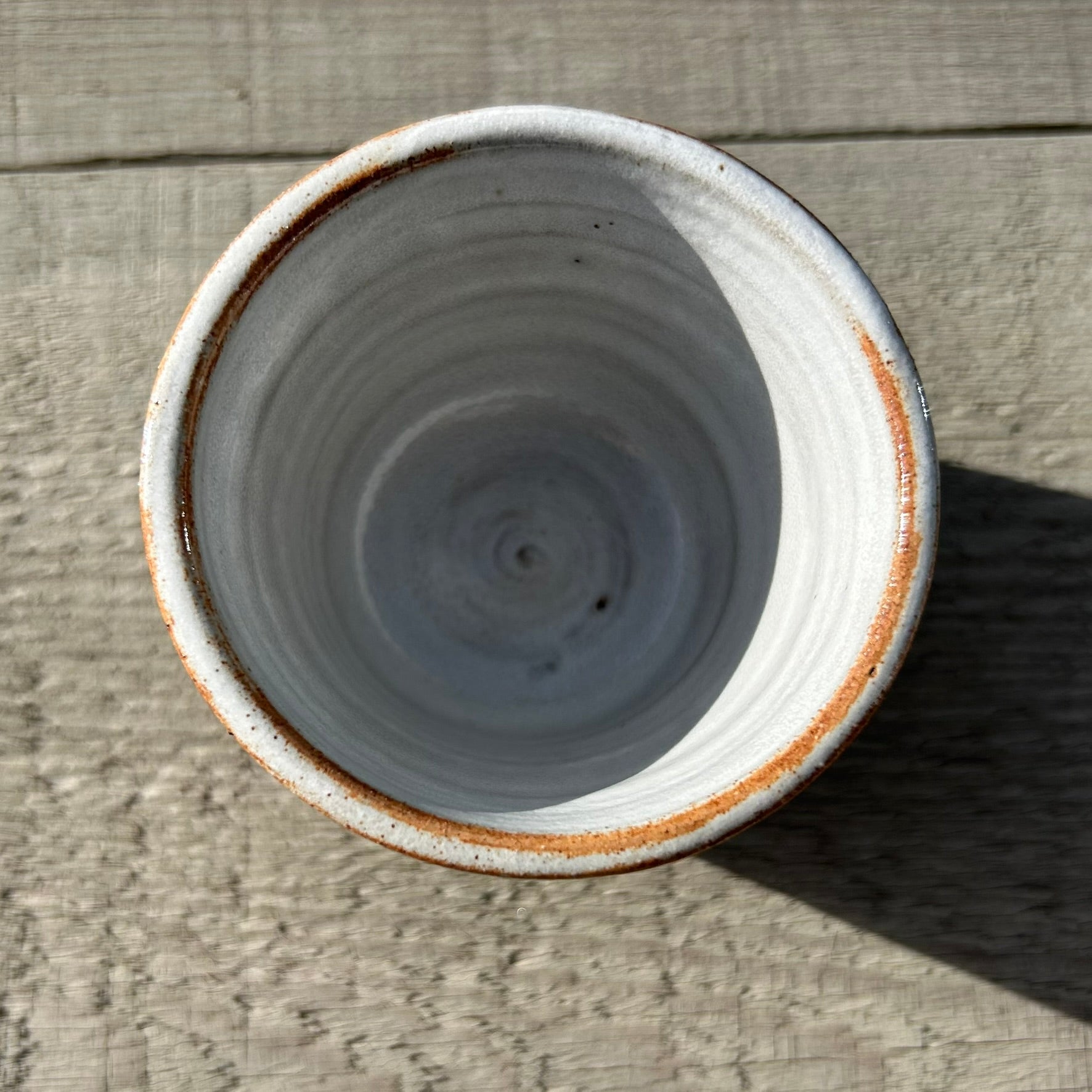 L’émail clair, posé sur une base de grès rouge, crée un contraste naturel et apaisant — une rencontre entre matière brute et lumière douce.