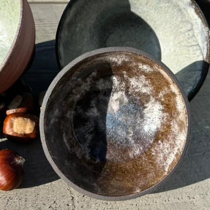 Tourné dans un grès sombre, ce bol révèle un émail profond aux reflets changeants, oscillant entre brun, cuivre et argent.